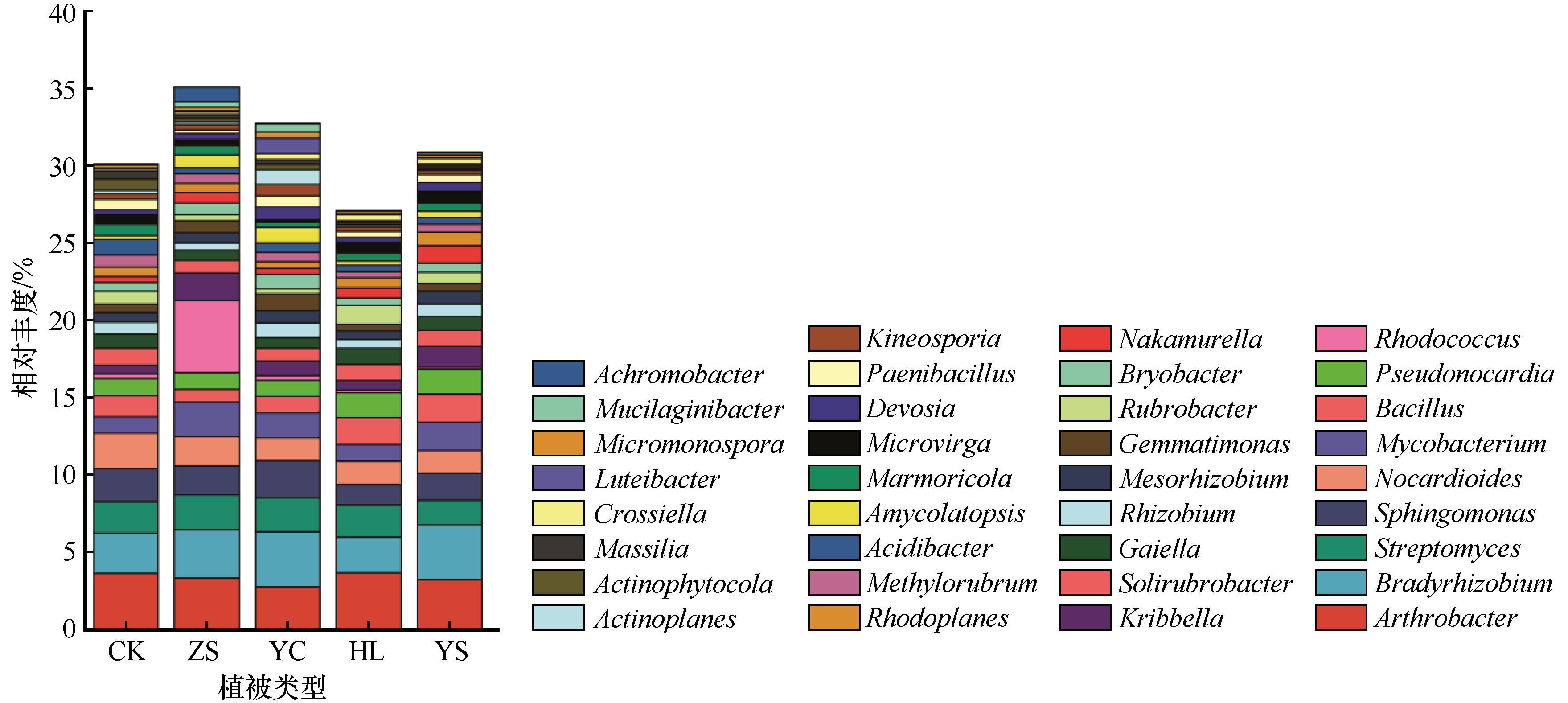 | Fig.4 Bacterial community composition of different vegetation restoration strategies at genus level |