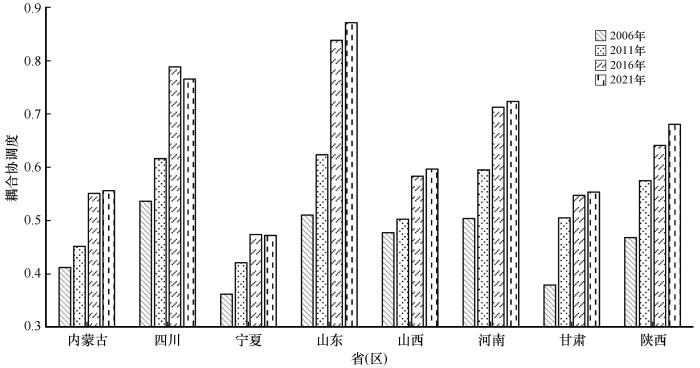 2006年,青海(0.180)为严重失调状态,宁夏(0.362)、甘肃(0.379)为轻度失调状态,内蒙古(0.412)、山西(0.477)、陕西(0.468)为濒临失调状态,山东(0.510)、河南(0.503)、四川(0.536)为勉强协调状态,除了四川省以外,其他两省均属于刚进入勉强协调的程度,青海是唯一处于严重失调的省份。2011年,青海(0.234)由严重失调进入中度失调行列,宁夏(0.420)和甘肃(0.505)由轻度失调分别进入濒临失调和勉强协调行列,山西(0.502)和陕西(0.575)由濒临失调状态进入勉强协调行列,内蒙古(0.451)仍处在濒临失调行列,山东(0.623)和四川(0.616)由勉强协调均进入初级协调行列,河南(0.595)仍处于勉强协调状态。2016年,山东(0.838)、四川(0.788)、河南(0.713)的耦合协调度持续稳步上升,山东(0.838)最先进入良好协调状态,四川(0.788)和河南(0.713)也相继进入中级协调行列,陕西(0.641)也由勉强协调状态进入初级协调状态,山西(0.583)虽仍处于勉强协调状态,但耦合协调仍在上升,内蒙古(0.551)、宁夏(0.474)、青海(0.309)也分别进入勉强协调、濒临失调和轻度失调行列。2021年,各省份耦合协调度均在稳定慢速增长,但耦合协调状态并未发生明显改变。山东(0.871)、河南(0.723)的耦合协调度保持低速增长,耦合协调状态未发生改变,四川(0.765)的耦合协调度有所下滑,但仍处于中级协调状态,内蒙古(0.556)、陕西(0.680)和甘肃(0.553)仍处于勉强协调行列。除了青海(0.322)外,黄河流域绿色创新与绿色金融耦合协调度增长较快,二者逐渐形成良好的协调关系。
