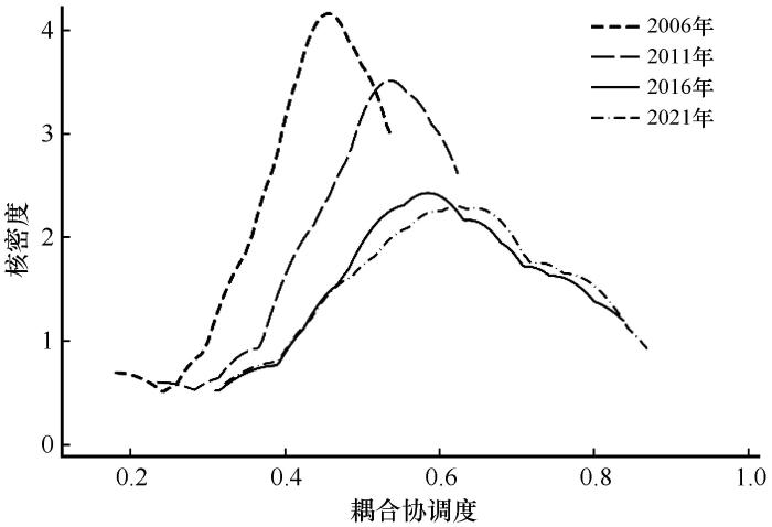 2006、2011、2016、2021年黄河流域绿色创新与绿色金融耦合协调度核密度估计