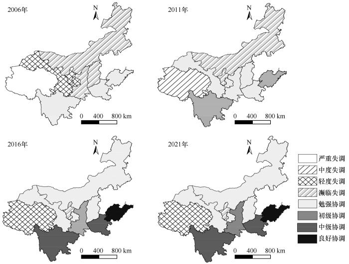 2006、2011、2016、2021年黄河流域耦合协调度的时空格局演化
