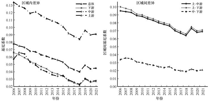 由图6可知,黄河流域绿色金融与绿色创新耦合协调发展方面的区域间基尼系数存在显著差异。从区域对比来看,上-下游地区的基尼系数在各区域组合中数值最大,而中-下游地区的基尼系数最小,在2006—2021年,三大地区的区域间基尼系数呈现出上-下游>上-中游>中-下游的特征。尽管在2018—2019年,总体以及上中下游各地区的基尼系数出现一定程度的上升,但从整体趋势而言,黄河流域绿色创新与绿色金融耦合协调发展的区域间差异依然保持着稳定缩小的态势。从变化趋势进一步分析,上-中游、上-下游以及中-下游区域间差异均呈现出下降趋势。其中,上-中游的区域间基尼系数从2006年的0.095下降至2021年的0.069,上-下游区域间的基尼系数由2006年的0.100下降至2021年的0.071,中-下游区域间的基尼系数从2006年的0.034下降至2021年的0.021。上-中游区域间和上-下游区域间的差异下降幅度均较为明显。其原因主要有以下两个方面,一是自党的十八大以来,国家对黄河流域的区域协调发展给予了更高的重视程度,特别是对于生态环境相对脆弱的黄河流域上游地区,国家出台了一系列针对性的财政政策和产业扶持政策。这些政策的实施,有效推动了上游地区绿色创新效率的提升,加速了上游地区在绿色金融与绿色创新领域的发展进程,进而缩小了与中、下游地区在该领域的发展差距。另一方面,数字经济的蓬勃发展为绿色金融推动跨区域合作创造了有利条件。数字技术的应用打破了地域限制,使得绿色金融在资源配置和资金流动方面更加高效便捷,增强了绿色金融对技术创新的支持力度。通过数字平台,上游与中、下游地区能够更有效地实现资源整合,促进了绿色金融与绿色创新在区域间的协同发展。