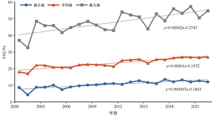 2000—2022年,库布齐沙漠植被覆盖度最大值年增长速率较大,平均0.677%,但相关性较弱,R ²≈0.559,植被覆盖度最小值年增长速率较小,达0.261%,相关性较大(R ²≈0.690),植被覆盖度平均值年增长速率为0.387%,相关性R ²≈0.832,相关性最强,可以很好地反映研究区域整体生态恢复趋势逐渐向好(图2 )。