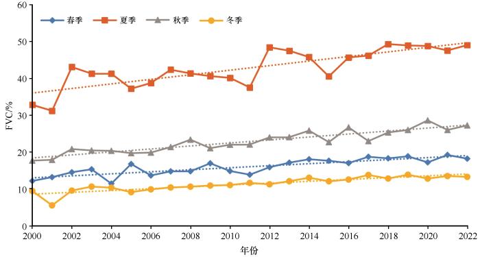 库布齐沙漠植被覆盖度的季节变化趋势均呈现明显波动上升趋势(图3 ),其中夏季和秋季的增长趋势最为突出,总体与年变化趋势保持一致。库布齐沙漠区域春季(3—5月)植被覆盖度整体上呈现波动上升的趋势,年代增长率为0.026%,线性趋势线拟合决定系数为0.72,增长趋势显著。2000年的植被覆盖度最低,为12.15%,2022年植被覆盖度达到最高,为19.20%。夏季(6—8月)植被覆盖度在2001年最低,为31.17%,在2018年植被覆盖度达到最高为49.26%。2018—2022年植被覆盖度逐年下降,直至2022年植被覆盖度降到47.53%,比峰值低1.73%。夏季植被覆盖度的年代增长率为0.063%,线性趋势线拟合决定系数为0.63,增长明显显著。秋季(9—11月)植被覆盖度波动幅度较小,2000年时植被覆盖度最低,为17.67%,在2020年时达到最高,为28.58%,总体呈现以0.041%的年代增长率持续上升趋势,线性趋势线拟合决定系数为0.82,增长趋势明显。研究区库布齐沙漠北部是黄河流域的河套平原地区,主要为农业种植区,在秋季农作物趋于成熟,植被覆盖度的增长也意味着研究区的耕地面积也有了一定程度的提高。冬季(12月至次年2月)植被覆盖度总体呈现明显上升趋势,最低值为2000年的5.53%,最高值为2019年的13.84%,2000—2022年年代增长率为0.026%,线性趋势线拟合决定系数为0.77,增长趋势显著。