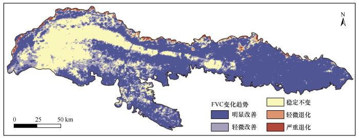 式中:i 为年序号;n 为研究年数;Ci 为第i 年的年平均植被覆盖度。slop 为正数,表征变化呈上升趋势,其值越大,意味着增加趋势越发明显;slop 为负数,则表征变化呈下降趋势,其绝对值越大,意味着减少趋势越发明显。