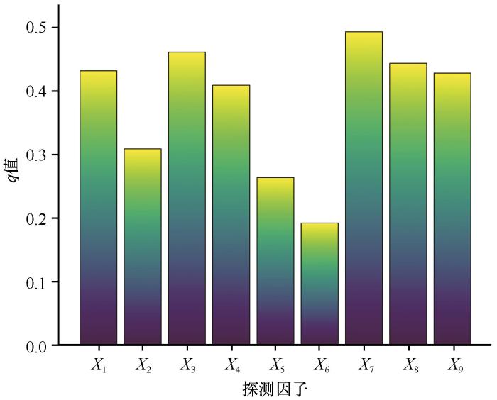 注: X 1 表示蒸散发量,X 2 表示风速,X 3 表示降水量,X 4 表示气温,X 5 表示土壤类型,X 6 表示高程,X 7 表示土地利用类型,X 8 表示人口,X 9 表示GDP;P <0.05