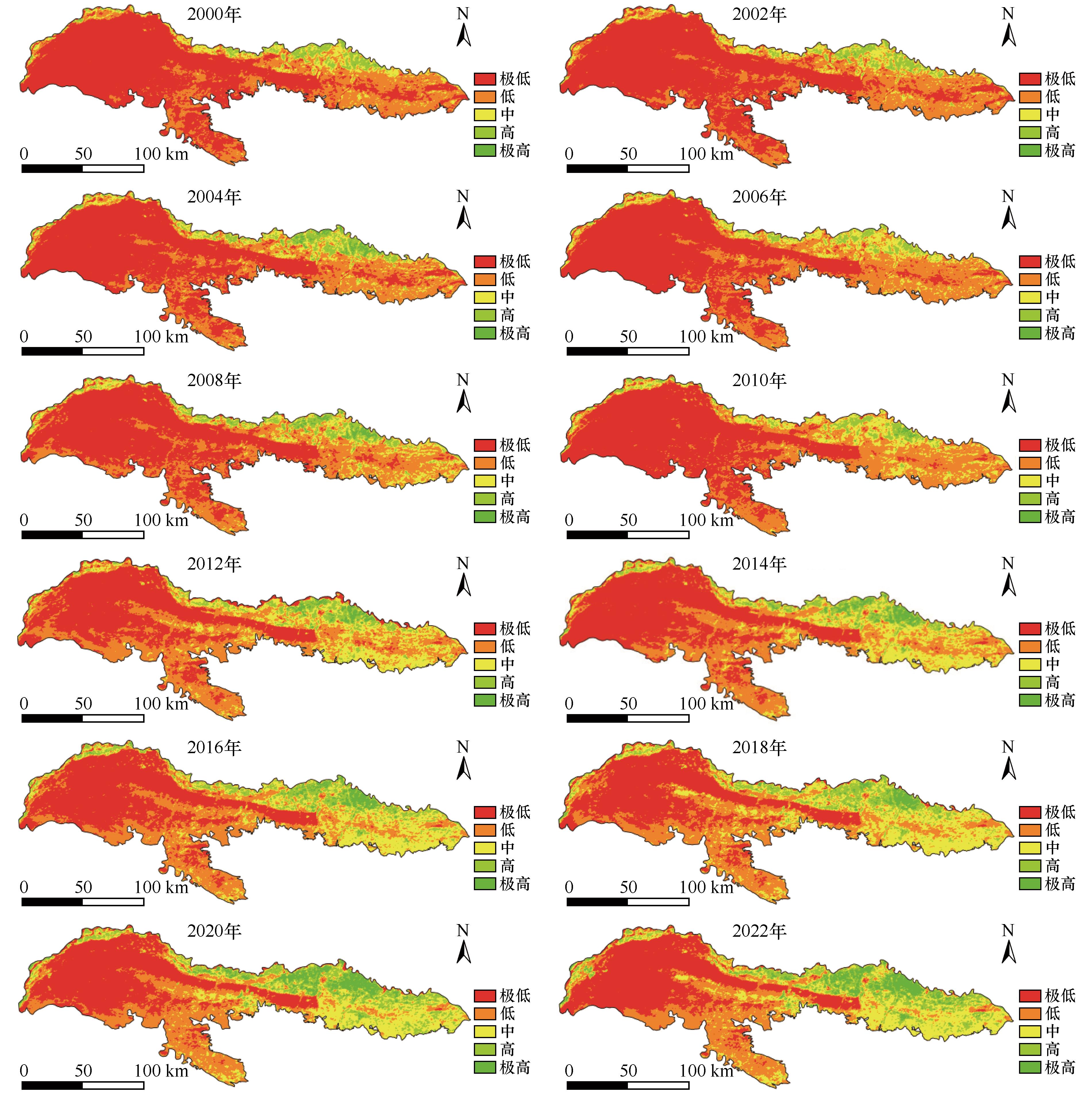 | 图4 2000—2022年植被覆盖度空间分布对比 |