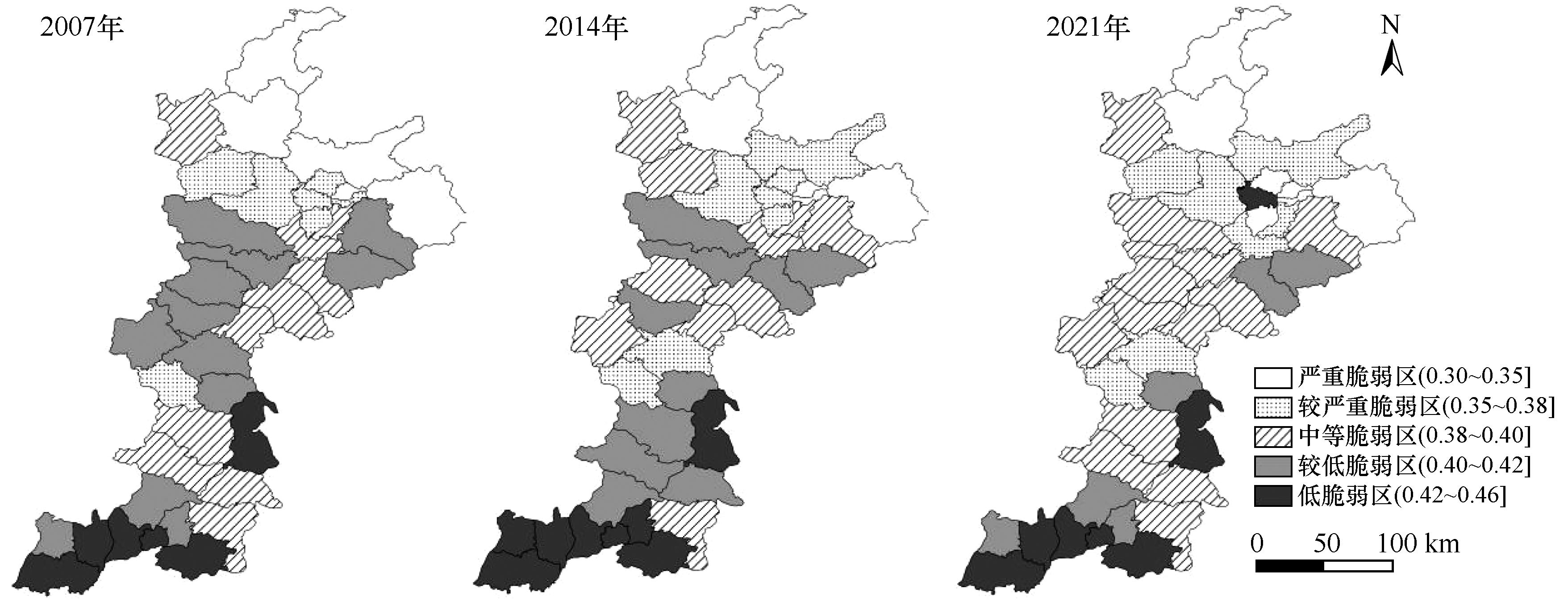 Fig.3 Spatio-temporal pattern of food production vulnerability in Fenhe River basin |