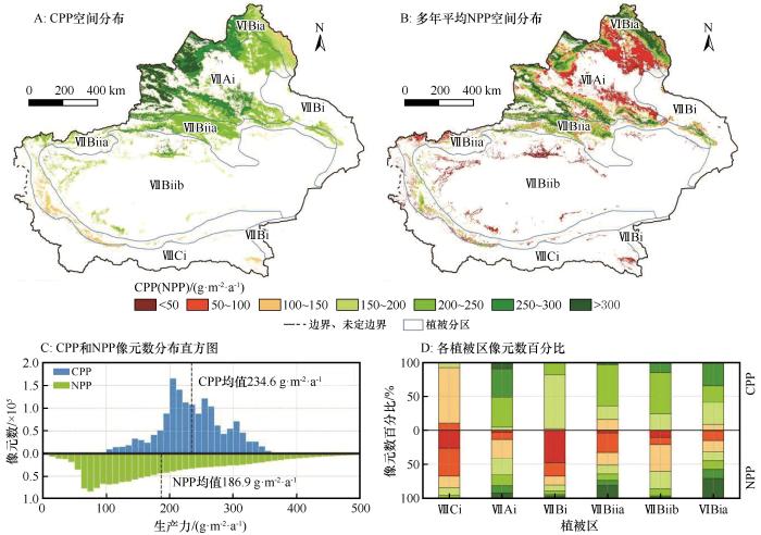 从分布直方图来看(图2 C),CPP值呈正态分布,对称且集中,峰度尖锐,峰值在200~230 g·m-2 ·a-1 ;NPP值则呈正偏态分布,较为分散,峰度低,峰值区在60~90 g·m-2 ·a-1 。此外,CPP均值高于NPP均值,且NPP值低于均值的像元占比高,但也有少量像元NPP值超过CPP,这可能与MODIS数据的精确度有关。从各植被区来看(图2 D),高寒荒漠地带(ⅧCi)81.7%的草地CPP值在100~150 g·m-2 ·a-1 ,体现了高寒地区水热条件差、草地生产力低的特点。而温带半灌木灌木荒漠地带(ⅦBi)草地CPP值多介于150~200 g·m-2 ·a-1 ,其面积占区域草地总面积的79.1%;对于暖温带灌木半灌木荒漠地带(ⅦBiia和ⅦBiib),CPP较高,多为200~250 g·m-2 ·a-1 ;温带半灌木矮乔木荒漠地带(ⅦAi)CPP更高,多为200~300 g·m-2 ·a-1 。各植被区多年平均NPP普遍较低且均低于区内平均CPP值,仅ⅥBia区例外。