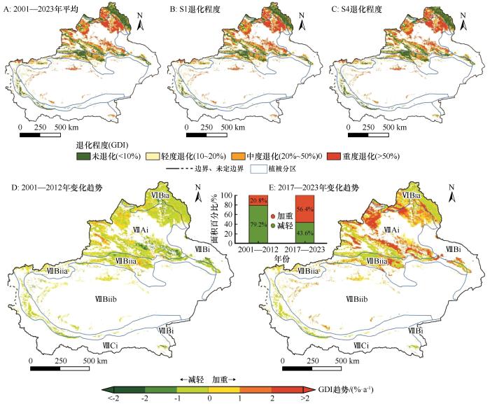 ... 由于GB 19377—2003规定的草地退化等级间阈值差异较大,难以分辨不同时期退化程度的转换情况,因而采用GDI变化趋势分析予以替代.根据年平均GDI时间变化特征(图3 B),空间变化仅分析2001—2014年(S1+S2)和2017—2023年(S4)两个时段(剔除可能存在局部异常值的S3时段),采用抗异常值干扰的Theil-Sen斜率计算分段趋势[24 ] ,结果如图4 D、E所示.2001—2012年,新疆草地退化程度总体呈减轻趋势,退化程度减轻的草地面积占79.2%,但显著减轻(P <0.05)的区域仅占总面积的5.6%,主要分布于天山北麓;退化程度加重区域占20.8%,主要分布在伊犁河谷以及博斯腾湖流域等地区(图4 D).2017—2023年,新疆草地退化程度总体呈加重趋势,退化程度减轻的草地面积占43.6%,主要分布于阿尔泰山、中天山和昆仑山北麓,但减轻趋势不显著;而退化程度加重区域占56.4%,其中显著加重(P <0.05)的占11.1%,主要分布在伊犁河谷、博斯腾湖流域以及准噶尔盆地周缘等地区(图4 E).空间趋势分析表明,过去20余年新疆草地退化程度整体趋于减轻,但局部地区存在恶化现象. ...