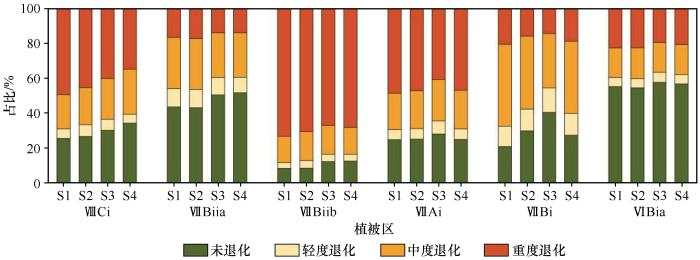 ... 从各植被区来看,各分区内的草地退化程度存在显著差异,除高寒荒漠地带(VIIICi)外,各区草地退化变化趋势呈现出较高的一致性(图5 ):在S1~S3时段退化程度有所减轻,而在S4时段退化程度则有所加剧.VIIICi地带的草地退化程度较高,但研究时段内重度退化草地面积显著减少,重度退化面积占比从S1时段的49.5%持续减少至S4时段的34.8%;分布于VIIBiia地带内的草地,因其主要处于盆地边缘的山麓带,水分条件稍好,未退化草地面积占比较高(约50%),退化程度相对较低,重度退化面积占比在15%左右,中度退化面积不超过30%;VIIBiib地带主要分布的是荒漠草地[12 ] ,退化程度最为严重,重度退化草地面积占比在70%左右,但分析时段内重度退化草地面积趋于减少;主要分布于准噶尔盆地周缘的VIIAi地带的草地退化程度较高,重度退化草地面积占比接近50%,S1~S3时段退化程度趋于减轻,但S4时段退化程度转为加重;VIIBi地带的草地主要分布于东疆地区,总面积较小,重度退化面积占比20%以下;VIBia地带的草地主要分布于阿尔泰山西麓,这里水分条件相对较好,因此总体退化程度较低,中、重度退化草地面积占比在40%左右,未退化草地面积超过55%. ...