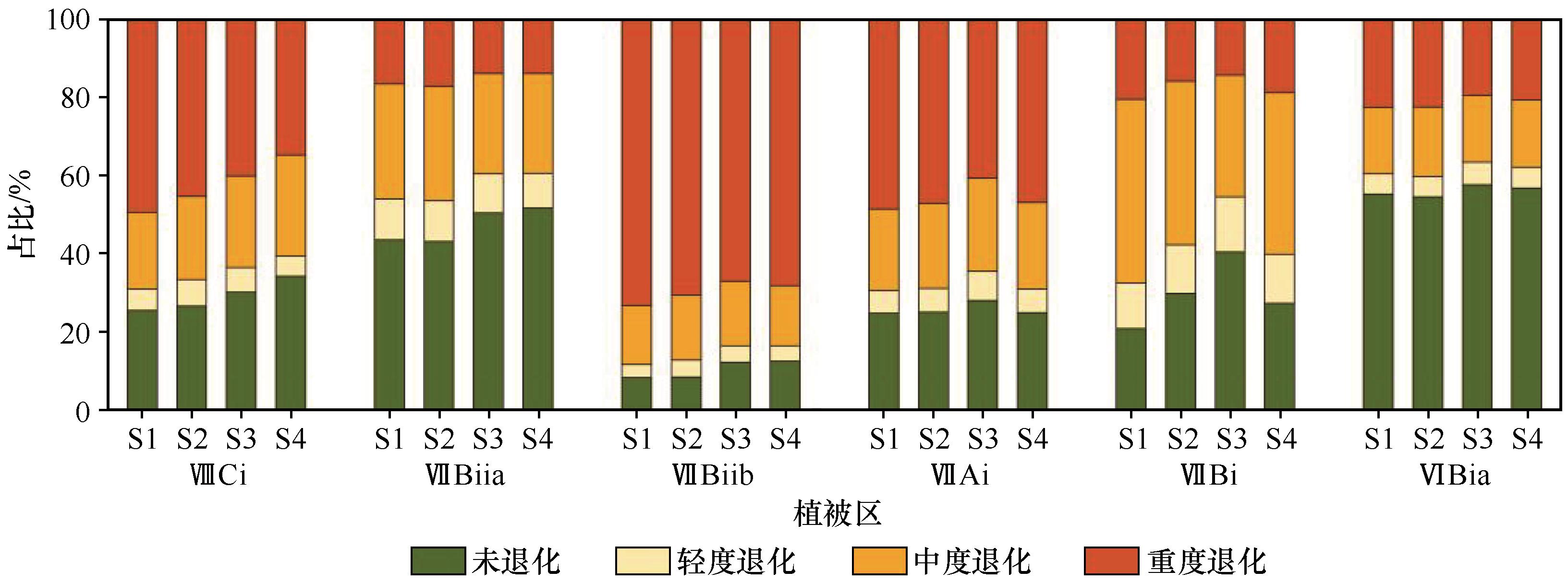 | 图5 不同时期各植被区草地退化程度面积百分比 |