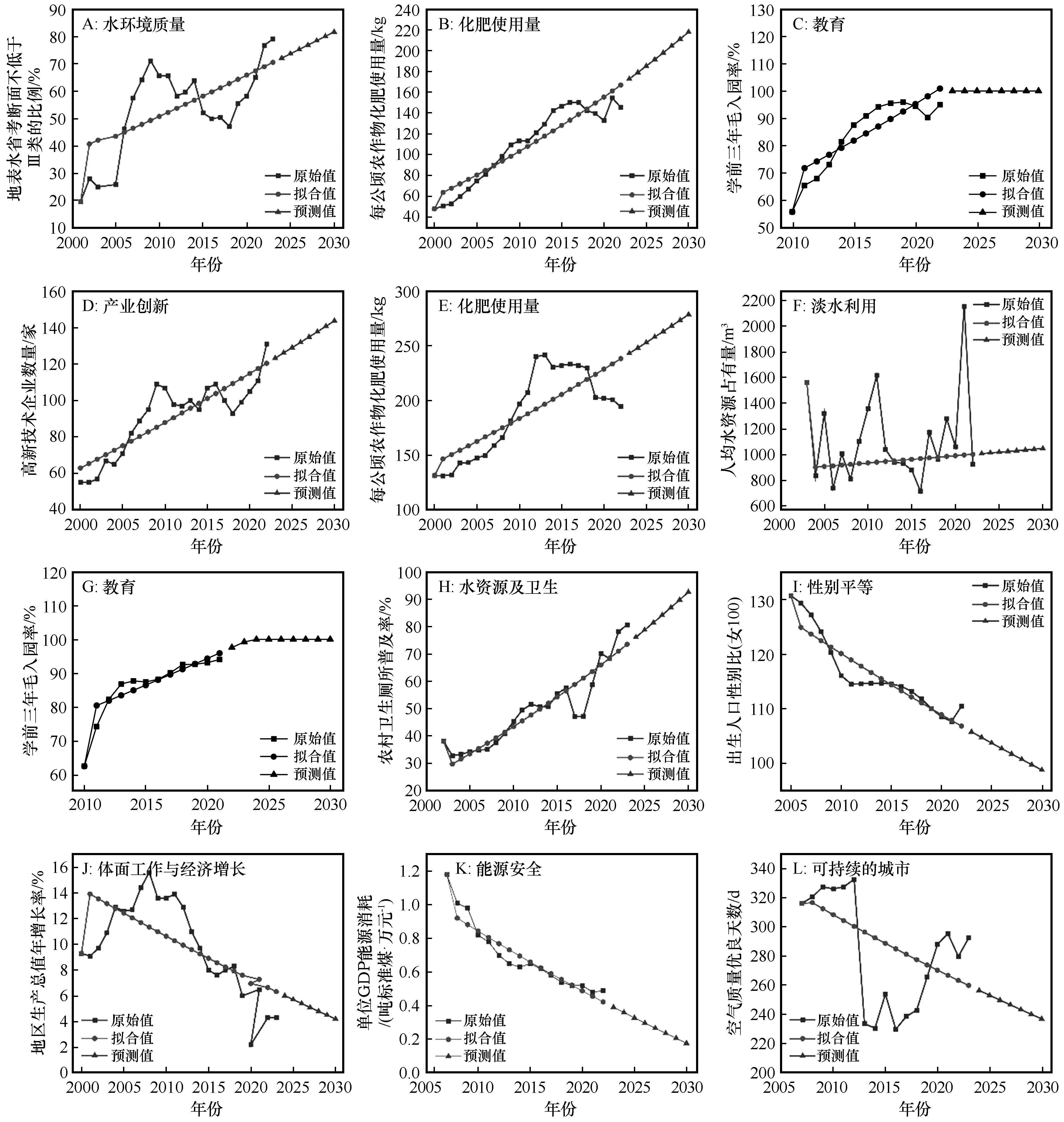 | Fig.3 Original, fitted, and predicted values of the breakthrough threshold indicators in Inner Mongolia Autonomous Region (A-D) and Shaanxi Province (E-L) |