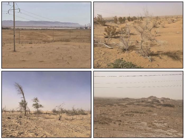 该区域为雅布赖山两侧洪积扇,西侧上风向流沙基本覆盖至洪积扇上部,并在强劲风力下通过各个高度不等的山体缺口向下风向移动;山体西侧的下风向地势相对平缓,由于山地剥蚀和洪水搬运,形成了宽泛的砾石戈壁区。天然植被主要包括霸王、白刺、猫头刺、红砂、刺旋花、油蒿等灌木,以及沿洪水冲沟零星分布的旱榆和蒙古扁桃等小乔木。植被盖度5%~8%。