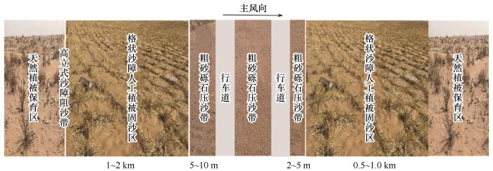对于孟根大梁附近两个单行车道间不足1 km范围内高出公路的风沙活动强烈路段,应全面采用覆盖粗砂砾石方式进行流沙固定,替代目前沙丘链顶部高立式沙障和机械沙障模式。公路上风向采取路边5~10 m粗砾石覆盖,外围1~2 km设置草方格或尼龙网格、PLA沙袋+高立式阻固沙障模式;下风向0.5~1.0 km采取草方格或尼龙网格、PLA沙袋固沙模式,以应对次风向形成的风沙危害(图7)。各类沙障规格应参考具体风沙环境状况制定,以发挥其最佳防护效能。