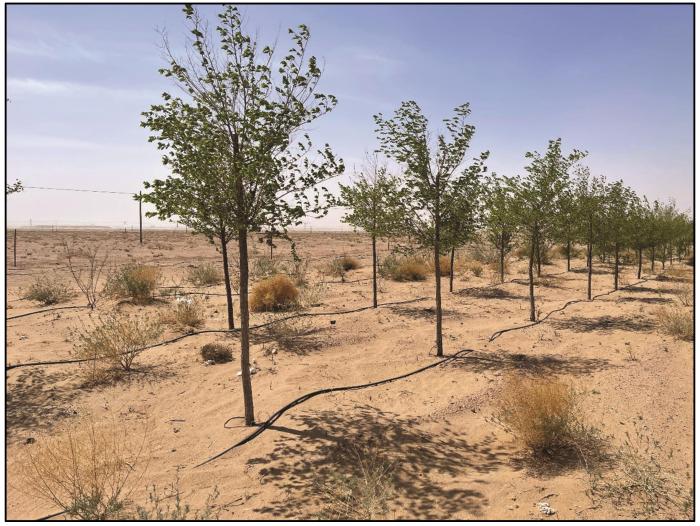 梭梭林更新可采取林地隔行、灌丛半幅等交替平茬方式,留茬高度10~20 cm,平茬枝条可就地平铺于灌丛间,以起到风沙固定和防护作用。干旱流沙环境苦咸水灌溉造林塔里木沙漠公路模式已成为中国防沙模式的成功案例[10]。在雅布赖镇及厂矿周围可铺设管道或以储水罐方式,就近利用地下水资源,开展滴灌补水,促进梭梭复壮。苦咸水灌溉应综合考虑灌溉用水水质、土壤类型、植物种类、气候条件和灌溉方式等区域条件,以制定包括灌溉周期和定额等方面的科学灌溉制度。在研究区已有部分区域开展了滴灌防护林造林(图8)。但在树种选择上,建议应优先考虑梭梭、柽柳(Tamarix spp.)、霸王、沙冬青(Ammopiptanthus mongolicus)和沙蒿等灌木半灌木乡土物种。