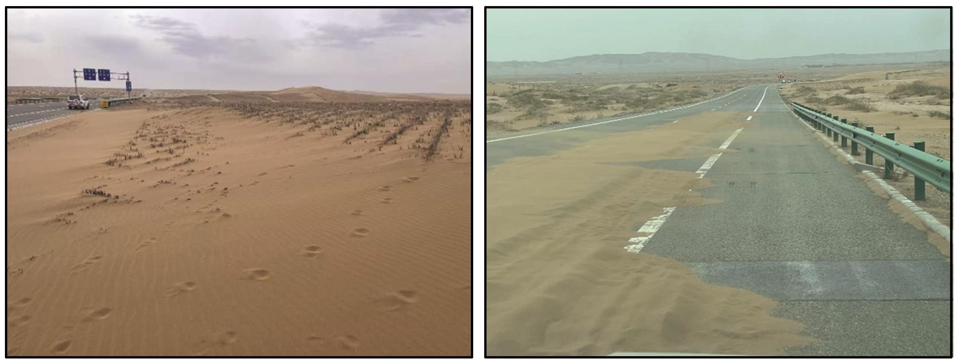 | 图2 孟根大梁道路上风向流沙与路面积沙情况 |