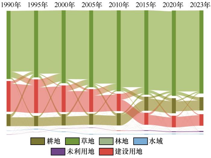 1990—2023年,毛乌素沙地土地利用发生显著变化,表现为草地由东向西显著增加,未利用地呈由东向西显著减少(图2)。其中,草地面积变化呈减少—增加—减少变化,2023年研究区内神木市、榆阳区、横山区、靖边县、定边县、伊金霍洛旗、乌审旗东部和北部的草地面积较1990年显著增加,毛乌素沙地近30年来草地面积增加主要来源于未利用地(图3),而未利用地面积则呈现出增加—减少的变化,在榆阳区、靖边县、乌审旗和伊金霍洛旗显著减少,这一时期的变化与“三北”防护林、退耕还林等一系列生态建设项目密切相关。耕地面积表现为减少—增加;林地和水域用地整体面积占比较少且变化不明显;建设用地面积整体占比偏少,但2023年较1990年建设用地在榆阳区和神木市的面积占比有较显著增加。