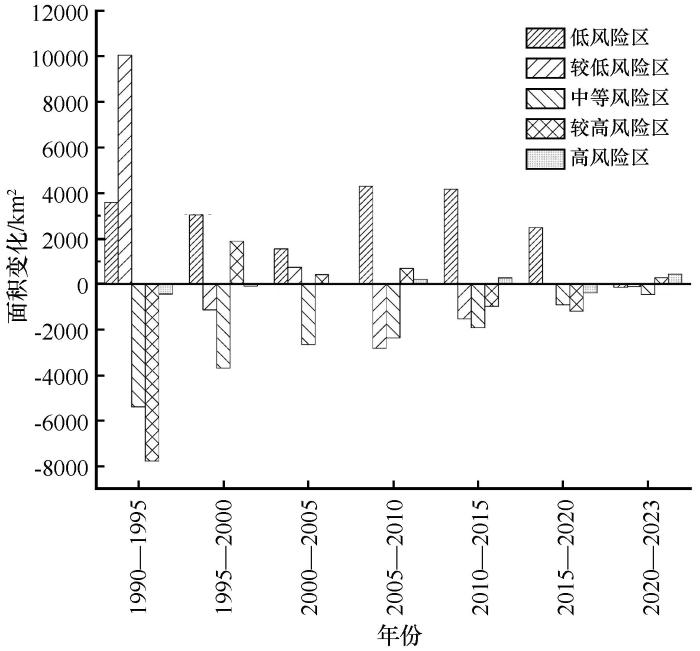 本研究ERI值1990年为0.0350~0.2190,1995年为0.0283~0.2053,2000年为0.0261~0.2113,2005年为0.0255~0.2046,2010年为0.0242~0.2239,2015年为0.0240~0.2127,2020年为0.0240~0.1848,2023年为0.0239~0.2168。根据沙地各风险小区ERI所处的范围,利用ArcGIS 10.8提供的自然断点法将生态风险划分为5个等级:0.02~0.04为低风险区,0.04~0.05为较低风险区,0.05~0.07为中等风险区,0.07~0.11为较高风险区,0.11~0.22为高风险区。从时间上看(图5),整体上沙地ERI有显著改善,高风险区面积减少不明显,但较高和中等风险区面积均有显著减少,而较低和低风险区面积显著扩大。分时段看,1990—1995年变化最为明显,较低风险区面积增加10 026 km2,中等、较高和高风险区面积分别缩小5 391、7 767、441 km2;1995—2005年,中等风险区面积变化最大,分别减少3 690、2 655 km2;2005—2020年,低风险区面积变化最大,分别增加4 284、4 158、2 475 km2;2020—2023年,各等级景观风险区域变化不大。
