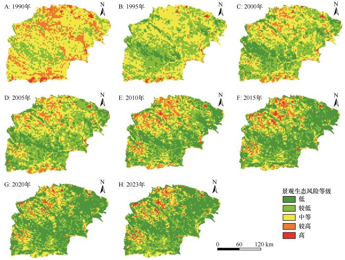 1990—2023年,毛乌素沙地呈现显著景观转型,未利用地面积缩减,主要转化为草地类型,辅以耕地扩张与建设用地增长,这与修晓敏等[27]研究结果一致。空间分异特征显示,草地、耕地和未利用地是主要的景观类型,耕地主要分布在沙地东部和南部,未利用地主要分布在沙地西部,主要是由于西部位于鄂托克旗、鄂托克前旗,在两旗有多处连绵的高大沙丘;草地面积占沙地总面积最大,分布呈分散状,Gao等[28]研究指出,通过“三北”保护林工程、新一轮“退耕还林还草”工程、京津风沙源治理和沙化土地禁养地试点工程,沙地生态修复方面取得了重大成果。总体来看,景观类型的变化反映了自然环境和政策干预对景观格局的影响,Mu等[29]研究指出政策对内蒙古景观格局变化有显著影响,而景观格局变化又是导致景观生态风险变化的重要原因,表明制度性干预对脆弱生态系统的重塑效能。