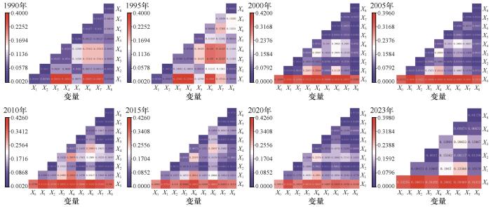 选取9个指标进行单因子探测,结果表明1990—2023年不同指标对毛乌素沙地景观生态风险影响存在显著差异,为进一步探究在自然因素和社会经济因素演进过程中是否存在多元因素共同作用,对9个指标进行交互因子探测(图8)。相较于单因子探测结果,各驱动因素交互作用对景观生态风险解释力呈增强态势,表明毛乌素沙地景观生态风险发展受多因素综合影响。各因子间交互作用均表现为双因子增强和非线性增强两种类型。图8表明:1990年,X1∩X3(0.280)、X1∩X4(0.280)、X1∩X6(0.259)、X1∩X7(0.259)交互作用值相对较高,对景观生态风险变化有较强解释力,说明自然和人类活动对景观分布有重要影响,X1∩X3、X1∩X4交互作用的q值最高;1995年,解释力排位前3的是X1∩X3(0.279)、X1∩X4(0.279)、X1∩X6(0.259),与1990年相比,整体上看大部分交互值均有提升;2000年,解释力排位前3的是X0∩X4(0.419)、X0∩X6(0.393)、X0∩X7(0.404),与1995年相比,人类活动对景观生态风险分布解释力减弱;2005年,解释力排位前3的是X0∩X1(0.394)、X0∩X6(0.390)、X0∩X7(0.394),该时期坡度、GDP密度、人口密度和夜间灯光交互作用解释力有所减弱;2010年和2015年因子交互影响q值前3的均是X0∩X1(0.416、0.377)、X0∩X4(0.425、0.390)、X0∩X6(0.423、0.369),其中2010年是研究期间交互因子解释力q值最高年份;2020年和2023年因子交互影响q值前3的均为X0∩X1(0.376、0.397)、X0∩X3(0.367、0.389)、X0∩X4(0.369、0.385),与1990年相比,人为活动对沙地景观生态风险分布交互因子解释力有明显提升。