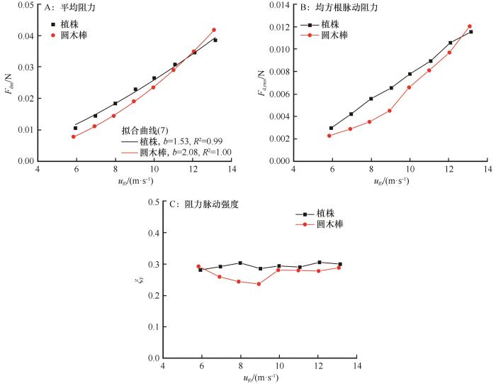 Variation of mean drag force (A), RMS fluctuation drag force (B) and drag force fluctuation intensity (C) of plant and rigid round stick with incoming wind speed