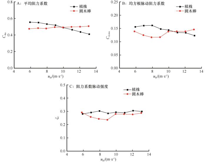 Variation of mean drag coefficient (A), RMS fluctuation drag coefficient (B) and drag coefficient fluctuation intensity (C) of plant and rigid round stick with wind speed