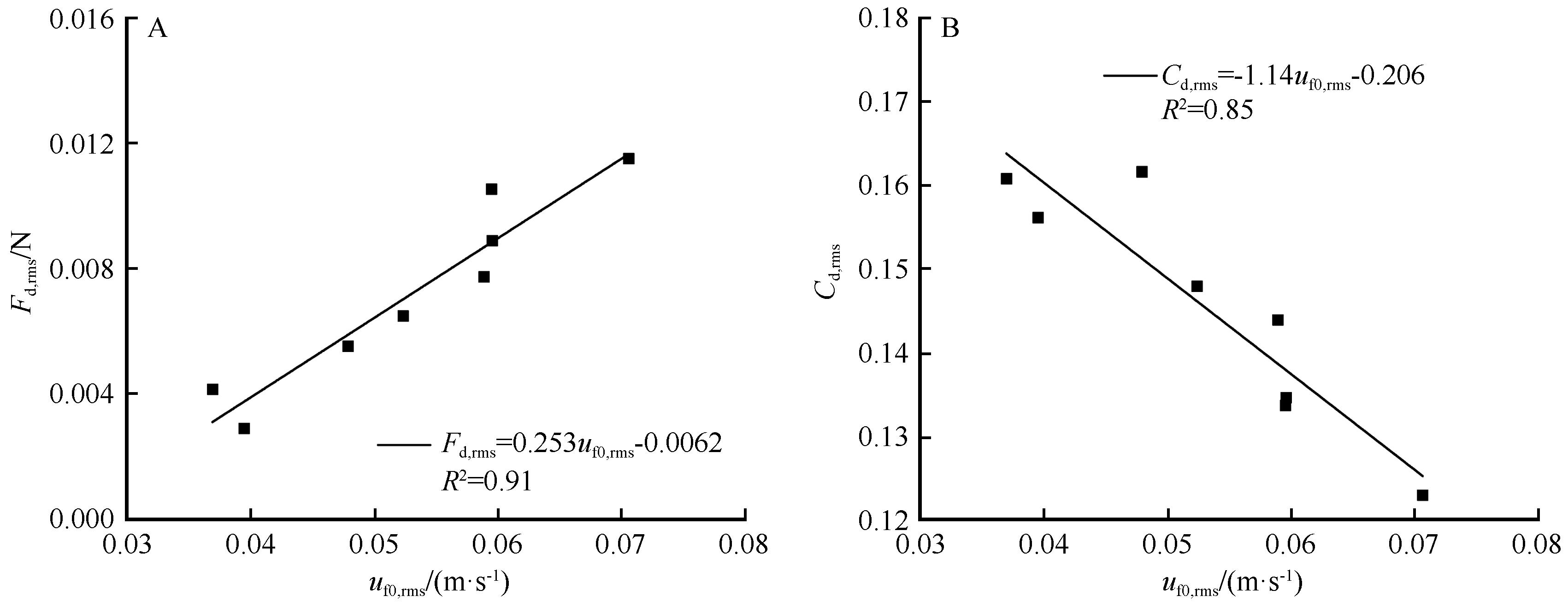 | 图11 植株均方根脉动阻力(A)、均方根脉动阻力系数(B)与均方根脉动风速(uf0,rms)的关系 |