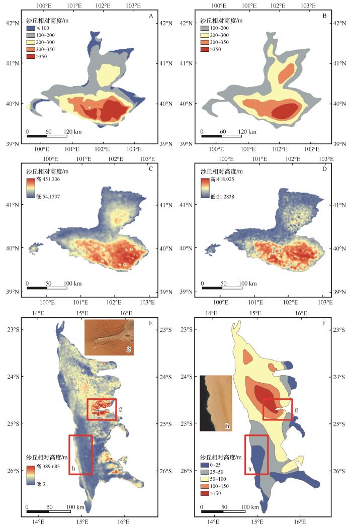 将本研究算法分别在巴丹吉林沙漠、纳米布沙漠计算的沙丘相对高度与前人研究结果进行对比(图4),为便于对比,本研究结果用前人划定的边界分别进行了裁剪,且使用了相似的可视化表达方法。①本研究的巴丹吉林沙漠、纳米布沙漠沙丘相对高度空间分布与前人研究结果基本一致。两个沙漠的沙丘相对高度均呈环带状自腹地向边缘递减,最高大沙丘分别存在于巴丹吉林沙漠东南腹地、纳米布沙漠东北腹地;巴丹吉林沙漠整体格局呈现东高西低,南高北低;纳米布沙漠整体格局呈现东高西低,北高南低。②从空间分布的细节上来说,本研究与汪克奇等[14]的研究均使用了数字地形分析方法,得到的空间分布图较人工测量结果更加精细,能体现更多空间分布特征的细节变化。③本研究与Lancaster[6]计算的纳米布沙漠沙丘相对高度空间分布图在部分区域存在明显差异。高分辨率影像显示:图4g区域干涸河道两侧存在明显的高大沙丘,且可能是整个沙漠最高大的沙丘,Lancaster[6]的结果中对此没有体现,本研究结果则可以很好地体现这一特征;图4h区域靠近海岸的沙丘高度分布并非弧形分布,而是条状分布,沙丘相对高度是海岸高于腹地,而不是腹地高于海岸,Lancaster[6]的结果与影像不符,本研究结果与影像一致。综上,本研究算法计算的沙丘相对高度在总体格局上与前人结果一致,但细节上更加精细和准确。