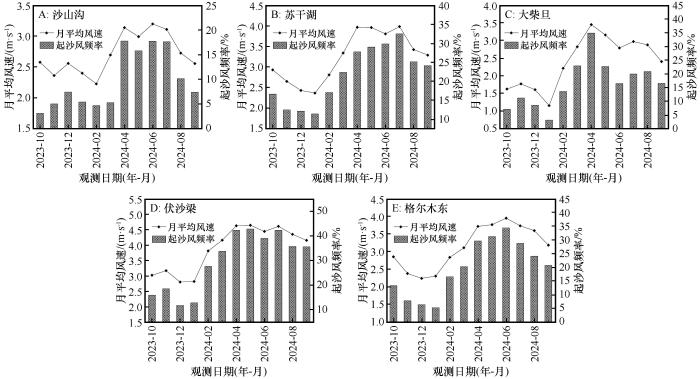 Monthly variation of mean wind speed and sand-driving wind frequency at each observation point in the study area