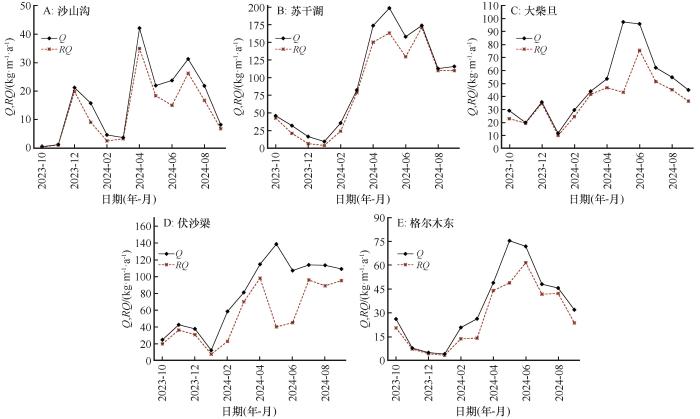 图8为柳格高速公路沿线观测点的最大可能输沙量。沙山沟4月Q、RQ最大,分别为42.13 kg·m-1·a-1、34.98 kg·m-1·a-1,占全年总量的21.45%、29.22%。夏季(5—7月)RA为SSE方向,其余季节RA分散(表2)。苏干湖5月Q最大,为198.69 kg·m-1·a-1,7月RQ最大,为163.26 kg·m-1·a-1,分别占全年总量的18.57%、17.63%。夏秋季(5—10月)RA为SSE方向,冬春季(11月至翌年4月)RA分散。大柴旦5月Q最大,为97.30 kg·m-1·a-1,6月RQ最大,为75.52 kg·m-1·a-1,分别占全年总量的16.56%、16.70%。全年RA主要为ESE和E方向。伏沙梁5月Q最大,为114.02 kg·m-1·a-1,4月RQ最大,为98.34 kg·m-1·a-1,分别占全年总量的11.94%、15.28%。全年RA为ESE和SE方向。格尔木东5月Q最大,为75.40 kg·m-1·a-1,6月RQ最大,为61.58 kg·m-1·a-1,占全年总量的18.29%、18.99%。全年RA主要为E方向。
