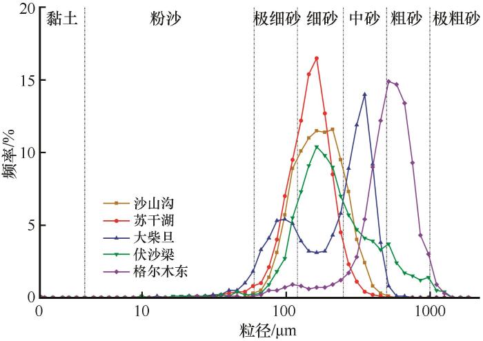 柳格高速公路沿线观测点沉积物的机械组成中,细砂(2~3 Φ)平均含量43.18%,中砂(1~2 Φ)平均含量23.90%,粗砂(0~1 Φ)和极细砂(3~4 Φ)平均含量共30.60%,以上占总含量的97.68%,而极粗砂(-1~0 Φ)和粉沙(4~8 Φ)平均含量总计2.32%,含量极小,黏土(>8 Φ)含量几乎为0(表3)。可以看出,柳格高速公路沿线沉积物分布范围适中,从极粗砂到粉沙均有分布,其组成以细砂和中砂为主。沙山沟、苏干湖和伏沙梁以细砂为主,占比分别为65.10%、69.80%、52.60%,大柴旦以中砂为主,占比为47.80%,格尔木东以粗砂为主,占比为59.60%。