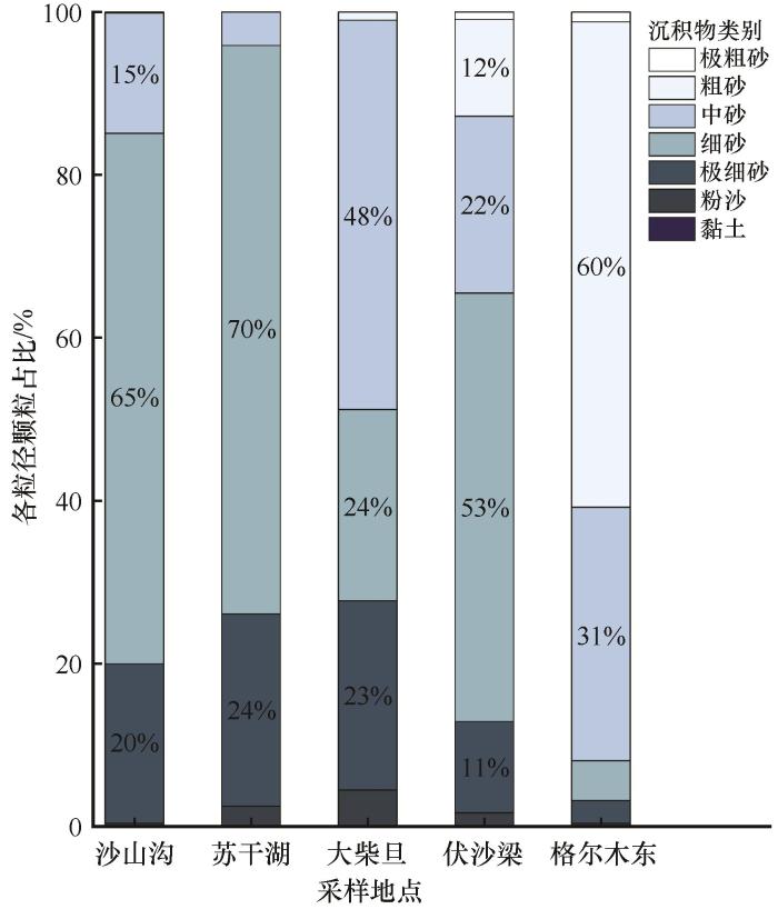 通过分析沉积物颗粒级配发现柳格高速公路沿线观测点的沉积物总体上以细砂和中砂为主,其中沙山沟、苏干湖和伏沙梁细砂含量最高,大柴旦中砂含量最高,格尔木东粗砂含量最高。对比沉积物各粒度参数发现,公路沿线自北向南,地表沉积物颗粒组成大致从细砂过渡到粗砂,沉积物平均粒径逐渐变大,研究区颗粒分布较均匀且粗颗粒物质较少。
