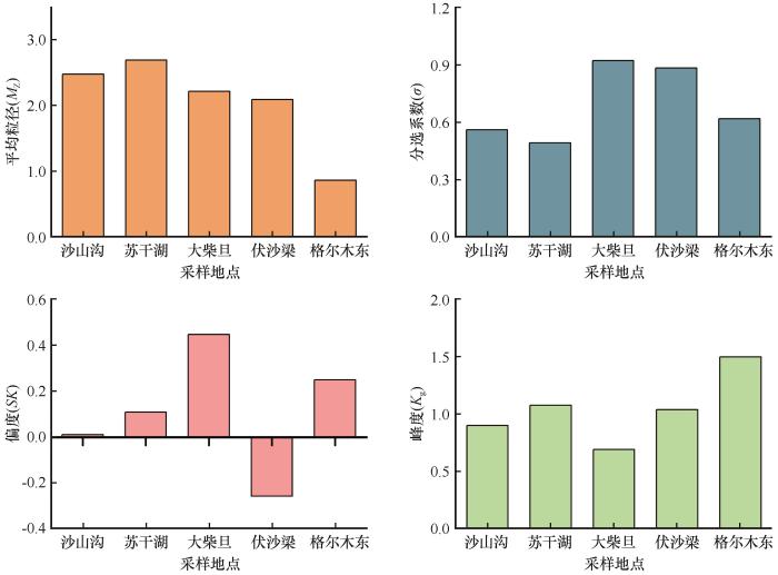 分析柳格高速公路沿线观测点粒度参数发现(图13),样品平均粒径0.86~2.69 Φ,其中最小值为格尔木东,最大值为苏干湖,粒度Φ值从沙山沟到格尔木东大致呈递减态势,说明沉积物平均粒径逐渐变粗,这与图12中的结果一致。对分选系数进行分析发现,苏干湖的分选好,沙山沟和格尔木东的分选较好,大柴旦和伏沙梁的分选均为中等,总体来看,柳格高速公路沿线观测点样品颗粒粒径分布较为集中,分选性较好[25]。伏沙梁样品偏度-0.3~-0.1,负偏;沙山沟偏度-0.1~0.1,近对称;苏干湖和格尔木东的偏度0.1~0.3,正偏;大柴旦偏度大于0.3,极正偏,说明在柳格高速公路沿线沉积物中粗颗粒物质总体来说较少[26]。格尔木东的峰度表现为尖锐,这表明该地区的大部分沉积物颗粒的粒径都集中在一个相对较窄的范围内[27-28],说明该地区的沉积物可能经历了较强的选择性搬运,导致某一特定粒径的沙粒特别丰富[29];沙山沟、苏干湖和伏沙梁的峰度表现为中等;大柴旦的峰度表现为平坦,这表明该地区不同粒径的沙粒分布较为均匀。