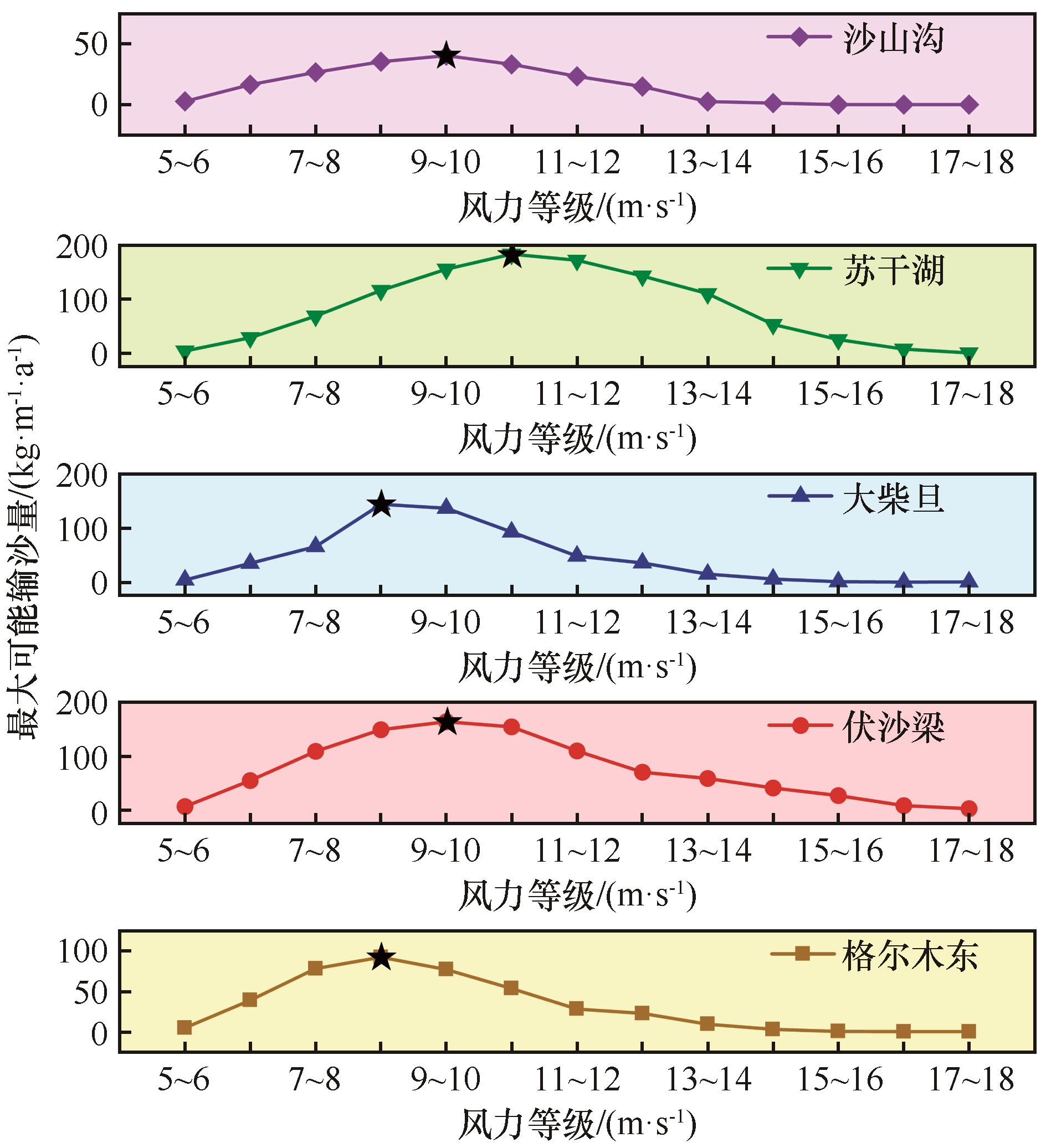 | 图10 研究区观测点各风力等级的最大可能输沙量 |