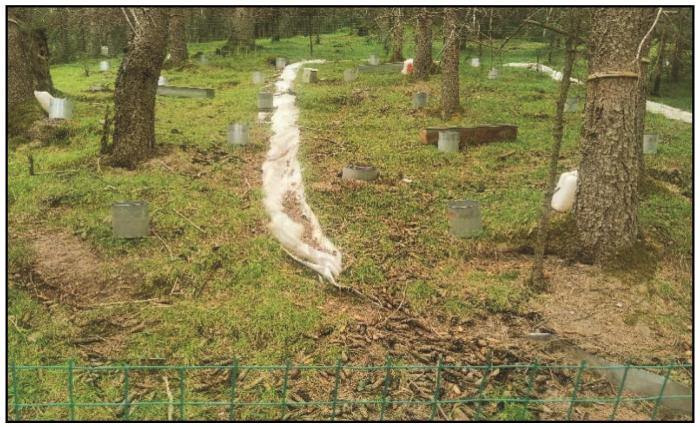 The distribution of the buckets for collecting water intercepted by forest canopy