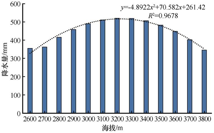 祁连山西水排露沟流域在海拔2 600~3 300 m内降水随海拔的升高而增大,3 300 m降水达到峰值,3 300 m以上随海拔的升高而降低。整个空间变化遵循多项式y =-4.8922x 2 +70.582x +261.42(R2 =0.9678),海拔2 600~3 200 m的百米递增率为6.91%,海拔3 200~3 800 m的百米递减率为6.53%。