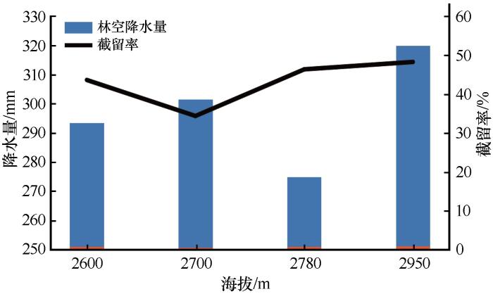 祁连山排露沟流域林空降水量、林冠截留率随海拔的变化