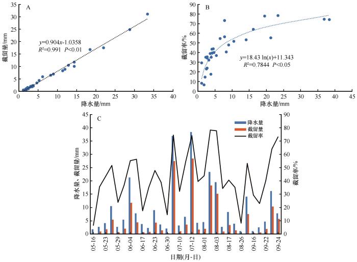 降水量与截留量具有显著的线性正相关关系(R2 =0.991,P <0.01),与截留率有较显著的递增对数函数关系(R2 =0.7844,P <0.05)。