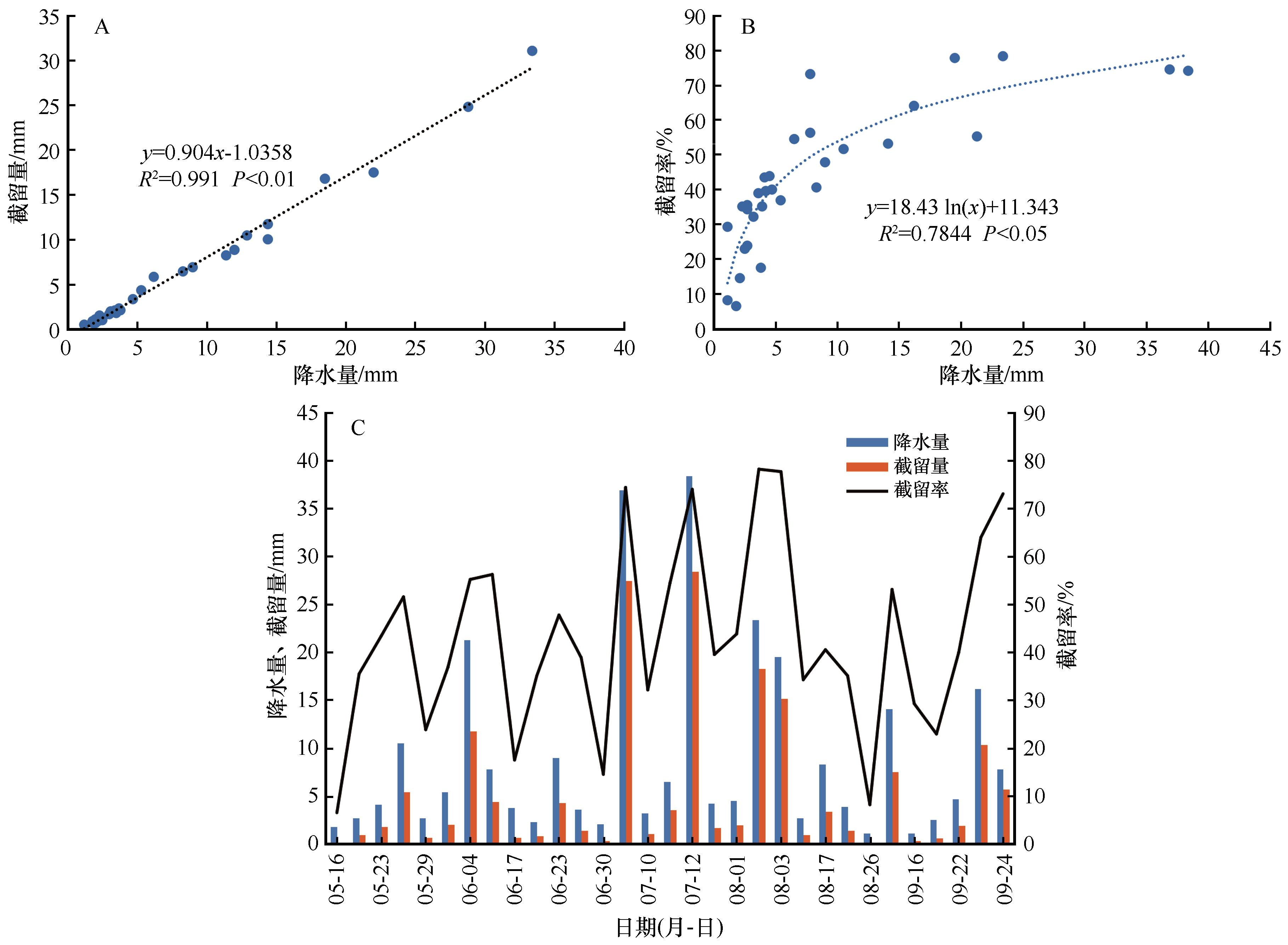 图7 祁连山排露沟流域降水量与截留量、截留率的关系 |