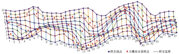 2019年7月,在对腾格里沙漠东南边缘固沙植被全面考察后,选择在半固定沙丘分布较广的长流水地区设置了一块试验样地(37°27′26″N、104°46′12″E,海拔1 573 m),样地大小为40 m×180 m,包含迎风坡、背风坡、丘底和丘顶4种微地貌类型。试验方案如下:①划分样地。将样地划分成10行×37列,共计370个小样方,每个小样方的大小为4 m×4 m。②土壤水分的测定。选取第3、6、9行对应的行作为土壤水分采样行,在沙丘地势起伏较大处增加采样点,每行24个采样点,总共设置72个土壤水分采样点(图1),利用土钻法进行采样称重测量0~300 cm垂直深度上的土壤水分。将0~300 cm的土层划分成18层,其中50 cm以上土层划分为0~5、5~15、15~25、25~35、35~50 cm,深度超过50 cm的土层每隔20 cm采样1次。③草本调查。选取样地中的第5行,利用0.5 m×0.5 m的草本样方框调查该行每个4 m×4 m小样方中草本植物的盖度和多度。然后,采用“全株收获法”将样方框中的草本植物割除,装入已编号的纸袋中带回实验室并置于65 ℃的烘箱中烘干至恒定重量,使用电子天平称重得到草本植物的生物量。④灌木调查:用标记牌对样地中的所有灌木进行标记并利用RTK进行定位。同时,利用钢卷尺测量每株灌木的株高以及东西和南北2个方向上的冠幅。在样地中的灌木植被下布设凋落物收集框,收集框直接接触地面,面积为50 cm×50 cm,将收集到的凋落物置于65 °C烘箱中烘干至恒重,使用电子天平称重得到凋落物数据。⑤地形因子的计算:利用RTK测量仪获取每个样方的顶点坐标,并通过数字高程模型计算每个样方的坡度、坡向和高差[17]。同时,研究区草本植物根系主要分布在0~40 cm深度的土层中,约80%的固沙灌木根系分布在40~200 cm深度土层,约10%的灌木根系分布在200~300 cm的土层内[17]。因此,本研究将土层深度划分为表层、中层和深层3部分。其中,表层为40 cm以上土层,中层为40~200 cm深度的土层,深层为200~300 cm深度的土层。
