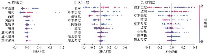 使用基于随机森林的SHAP模型,对地形和植被因子对土壤水分影响的重要性进行排序,平均绝对SHAP值的大小反映了该变量对土壤水分影响的强弱。绝对值越大,变量对土壤水分的影响越强。平均绝对SHAP值为正表明变量对土壤水分变动具有正向作用。从变量取值大小来看,变量值高呈现红色,变量值低呈现蓝色。图4和图5的结果表明,各变量对不同深度土壤水分影响的重要性并不完全相同,从综合排序结果可以看出:草本盖度、坡向和高差对表层土壤水分的影响较大;坡向、草本盖度和生物量对中层土壤水分的影响较大;灌木盖度、坡向和草本盖度对深层土壤水分的影响较大。其中,生物量和灌木盖度对土壤水分的影响相似,变量取值较高对土壤水分产生负面影响;坡向和高差对土壤水分的影响相似,变量取值较高对土壤水分产生正面影响。草本盖度呈现出的影响能力较为复杂,但变量取值较高时对土壤水分呈现负面影响。