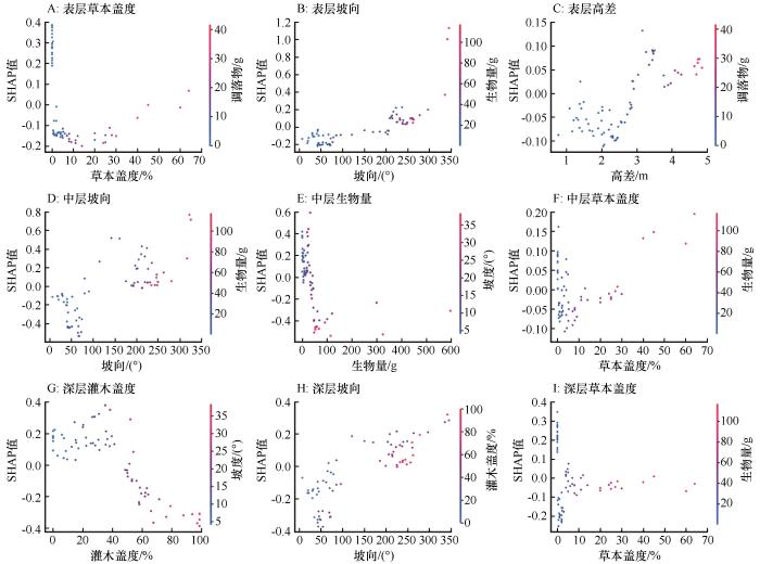 图6进一步描述了重要的影响变量对土壤水分的影响规律。横坐标表示变量的取值,左侧纵坐标表示该变量的SHAP值,右侧纵坐标表示与该变量交互作用最大的变量的取值。草本盖度在0附近时,对土壤水分既可能产生正面影响也可能产生负面影响,这可能是由于草本盖度较低时的影响作用不明显或者需要结合灌木因子确定。随着草本盖度增加,对土壤水分首先表现出负面影响,当草本盖度超过40%时,对土壤水分又具有正面影响。当坡向低于200°时,其对表层土壤水分产生负面影响,高于200°时对表层土壤水分产生正面影响;低于100°时对中层和深层土壤水分产生负面影响,高于100 °时产生正面影响。高差低于3 m时,对表层土壤水分产生负面影响;高于3 m时,产生正面影响。生物量低于30 g时,对中层土壤水分产生正面影响,高于30 g时,产生负面影响。灌木盖度低于40%时,对深层土壤水分产生正面影响;高于40%时,产生负面影响,且随灌木盖度增加负面影响增大。也就是说,不同深度土壤水分均随草本盖度和坡向增加呈先下降后上升趋势,表层土壤水分随高差增加呈先下降后上升趋势,中层和深层土壤水分分别随生物量和灌木盖度增加呈先上升后下降趋势,均存在一定的阈值效应。