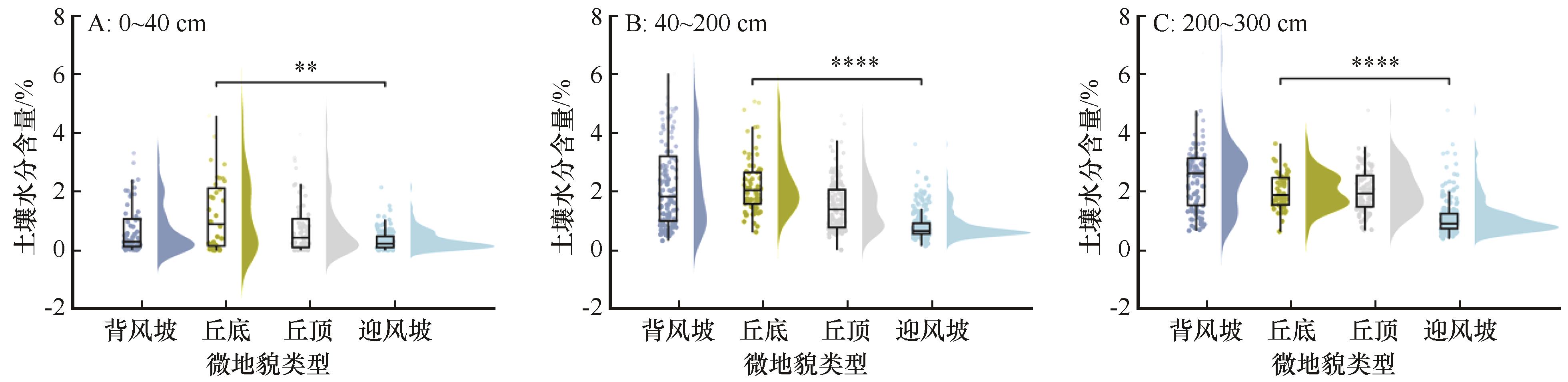 | 图2 4种微地貌上表层、中层和深层土壤水分的分布 |