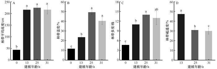 ... 防风林带和固沙林带的结构与效能受树叶、枝条及树干的密度、空间分布和排列方式影响,这些又与树种选择、孔隙度、林带密度和覆盖率密切相关[35-36].本研究选取建植13、25、31 a的3条防护林带,通过系统调查其结构与植物群落特征,揭示了林带结构随建植年龄演变的规律性.在树种组成上,不同年龄林带存在明显差异.建植13 a林带以花棒、梭梭为主;而建植25 a和31 a林带中,柠条与梭梭逐渐占据优势地位(表2).其中,花棒作为先锋树种,生长迅速,耐风蚀、耐沙压,具备较强的固沙能力[37];柠条前期生长缓慢,后期适应性强,成活率高,逐渐成为稳定群落的主力物种[38-39].草本层以多年生物种为主,种类稳定,主要为禾本科和菊科植物,具备良好的耐旱性与环境适应性(表1,表2).其种子多靠风力传播,繁殖能力强,适合干旱多风的生境[40].群落结构指标表现出显著的时间演变特征.林带高度、盖度和多度总体呈先升后降趋势:建植13 a林带处于快速生长期,群落结构简单但活力强;建植25 a林带结构趋于成熟,固沙与适应能力最强,高度、盖度和多度达峰值;建植31 a林带出现老化现象,群落更新缓慢,生长趋于停滞[41].疏透度随建植时间延长显著下降(P<0.01),说明林带封闭性增强、阻风效应提升[42].其中建植25 a林带在植物生长与群落发育方面表现最优,建植约25 a为本区固沙林带结构优化的关键期. ...