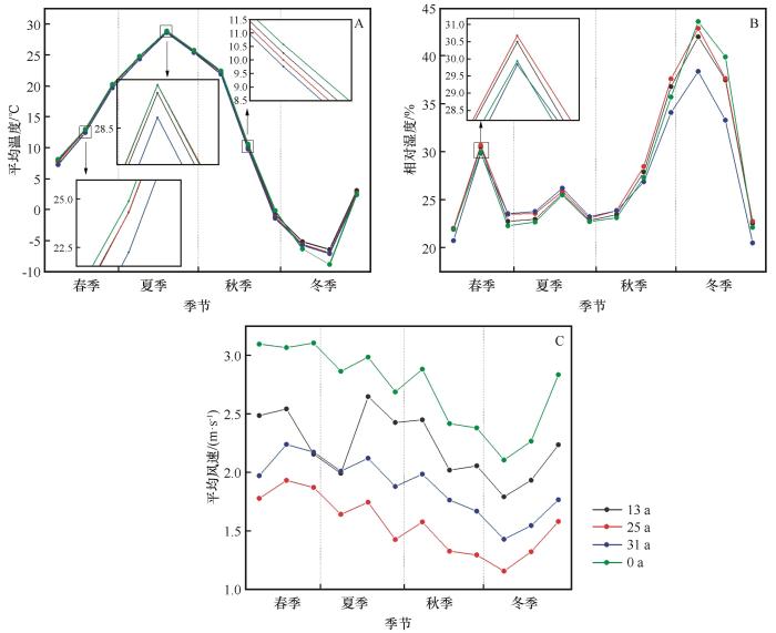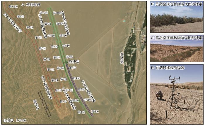 ... 在干旱半干旱地区,人工防护林带的建设有效地减弱风速、固定流沙、改善土壤、调节小气候,提升生态稳定性和土地利用效率[1-2].在文物保护区内,防护林带通过阻挡风沙入侵、调节微气候,有效减缓风蚀与气候波动对壁画和彩塑的破坏,构建起文物安全的重要生态屏障[3-4].当前,全球约有20%的文物古迹处于风沙侵蚀严重的干旱与半干旱地区,受气候变化与人类干扰双重影响,文物保护面临严峻挑战[5-6].风沙侵蚀不仅直接损毁文物结构,还通过改变局地热湿环境,加速壁画与建筑材料的老化与劣化[7-10].为应对上述问题,防护林带作为稳定生态因子的长期防线,已成为文物区防风固沙的关键手段[7].1992—1993年,针对莫高窟窟顶风沙入侵问题,选用耐寒抗旱乡土灌木构建两条人工防护林带,年积沙量超7 000 m³,入沙量减少约60%[11-12].2011年进一步增设3条林带,结合滴灌系统建成植物固沙面积达110 160 m²,防护成效显著提升.然而,现有研究集中于林带早期防护能力评估,较少关注防风林防风固沙功能的时空演变过程以及防护林带防效的长期稳定性.这是文物区生态保护系统构建中亟须深入研究的核心问题[7-8,13]. ...