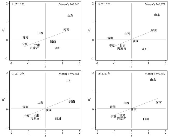 使用莫兰指数(Moran's I )检验各省(区)的高质量发展水平之间的空间依赖性,计算得出2013—2023年黄河流域各省(区)高质量发展水平的莫兰指数均为正值,且通过5%显著性水平检验,表明黄河流域各省(区)间存在显著的空间正相关性。本文使用W 1 为例,绘制了2013、2016、2019、2023年流域高质量发展水平的局部莫兰散点图(图1 ),横坐标代表省(区)的高质量发展水平,纵坐标代表高质量发展水平的空间滞后项。绝大部分省(区)位于第一象限和第三象限,高质量发展水平较高的省(区)的周边地区高质量发展水平也较高,如山东、河南等地,高质量发展水平较低的省(区),其邻近区域的发展水平也往往偏低,如内蒙古、宁夏和甘肃,呈现高高聚集和低低聚集的特征,表明各省(区)高质量发展水平在空间上具有正相关性。