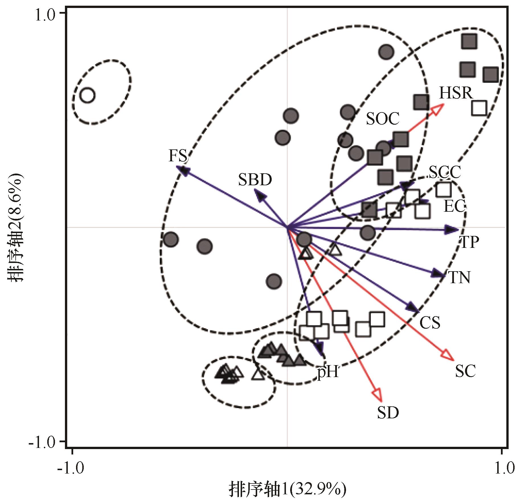 Fig.4 The RDA two-dimensional ordination diagram of soil environment with explanatory variables among mobile sandy dune (MSD), fixed sandy dune (FSD) and Haloxylonammodendron plantations (HAs) of different ages |