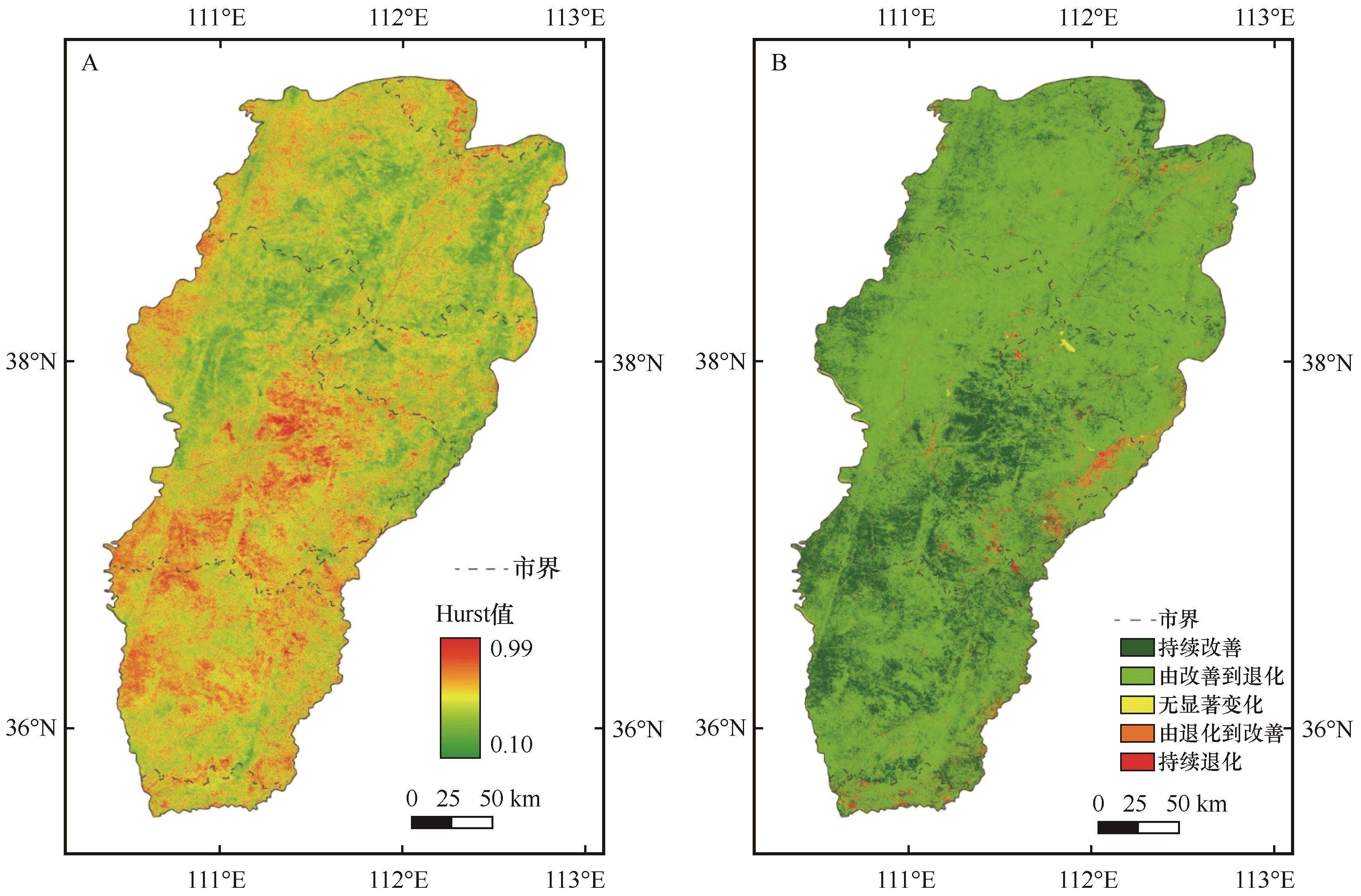 | Fig.8 NDVI Hurst value (A) and future trend prediction (B) in the Lvliang Mountain area |