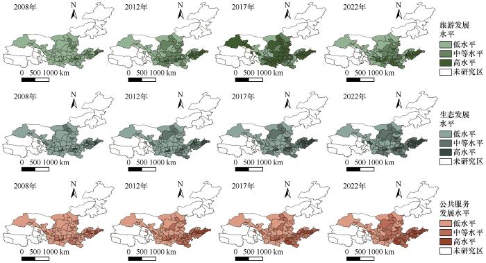 基于熵权-TOPSIS法分别测算旅游、生态和公共服务综合发展水平,并以2012年为基准利用ArcGIS 10.8自然断点法[26]将旅游依次划分为高水平区域(0.1430,1.0000)、中等水平区域(0.0842,0.1430)和低水平区域(0.0000,0.0842);将生态依次划分为高水平区域(0.1675,1.0000)、中等水平区域(0.0679,0.1675)和低水平区域(0.0000,0.0679);将公共服务依次划分为高水平区域(0.2155,1.0000)、中等水平区域(0.1097,0.2155)和低水平区域(0.0000,0.1097)。绘制2008、2012、2017、2022年黄河流域旅游、生态和公共服务发展水平空间分布图,发现各系统发展水平空间分布存在不平衡性(图3)。