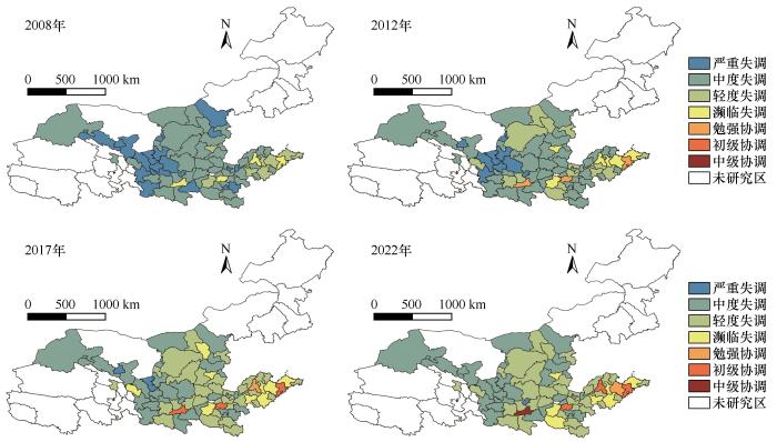 2008、2012、2017、2022年耦合协调度空间演变格局